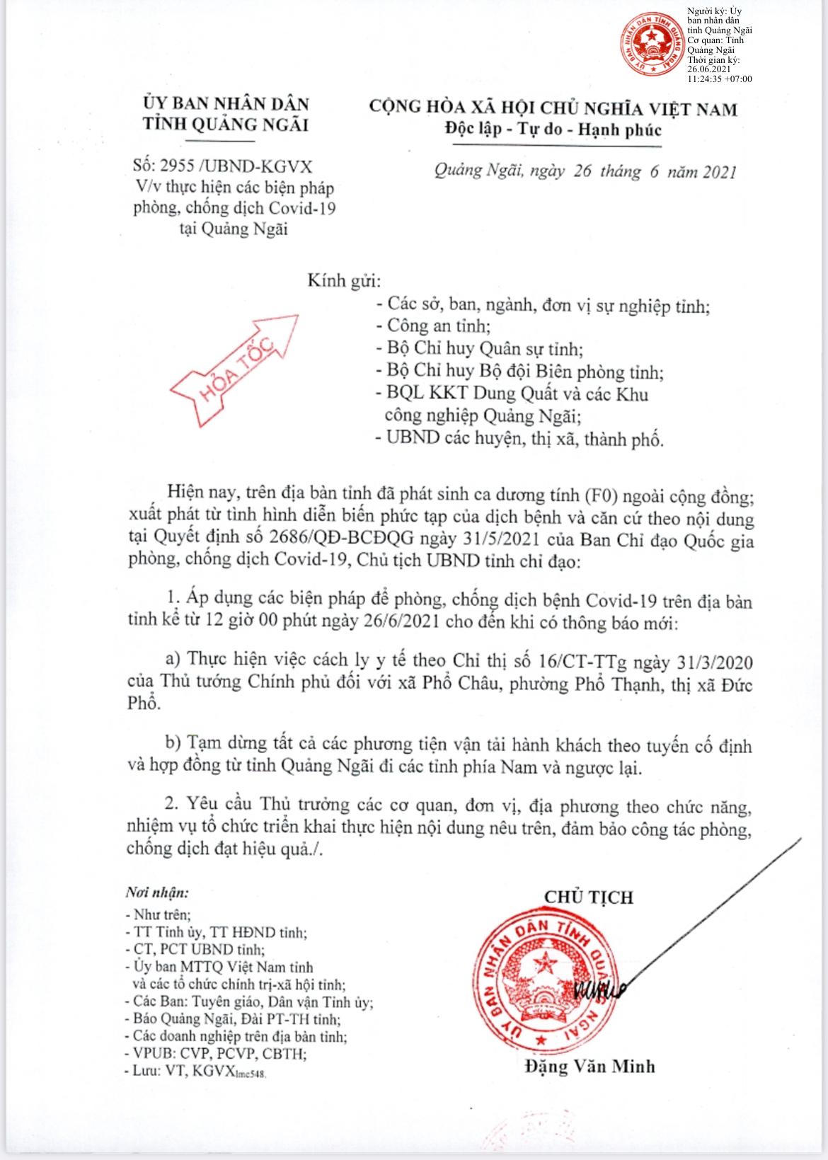 Công văn do ông Đặng Văn Minh, Chủ tịch UBND tỉnh Quảng Ngãi ký sau cuộc họp khẩn diễn ra vào sáng cùng ngày. Theo ông Minh, trong những ngày gần đây, dịch diễn biến phức tạp vì hầu hết các tỉnh lân cận đều có ca bệnh. Đặc biệt, Quảng Ngãi ghi nhận 5 ca nhiễm trong cộng đồng dù bộ y tế nhưng đã có kết quả từ CDC.