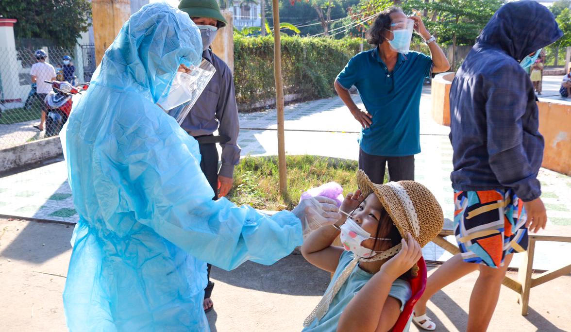 Nhân viên y tế đang lấy mẫu xét nghiệm cho người dân ở thị trấn Châu Ổ, huyện Bình Sơn, tỉnh Quảng Ngãi. |