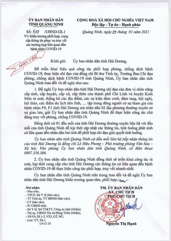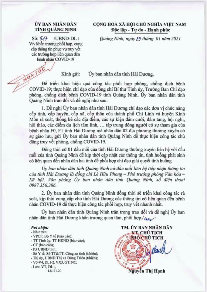 (PLVN) - Ngày 29/1, UBND tỉnh Quảng Ninh đã có công văn hỏa tốc gửi UBND tỉnh Hải Dương về việc khẩn trương phối hợp, cung cấp thông tin phục vụ truy vết các trường hợp liên quan đến bệnh nhân COVID-19