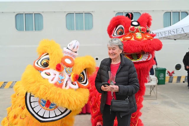 Ngay khi đặt chân xuống cảng, du khách được chào đón bằng nghi thức truyền thống đặc sắc. Trong tiếng trống sôi động của tiết mục lân sư rồng đón tiếp những vị khách “xông đất”, ông Phạm Đức Ấn, Chủ tịch UBND tỉnh Quảng Ninh, bà Nguyễn Huyền Anh, Giám đốc Sở Du Lịch Quảng Ninh đã trao những bó hoa tươi thắm, gửi lời chúc mừng năm mới đến những vị khách quốc tế đặc biệt.