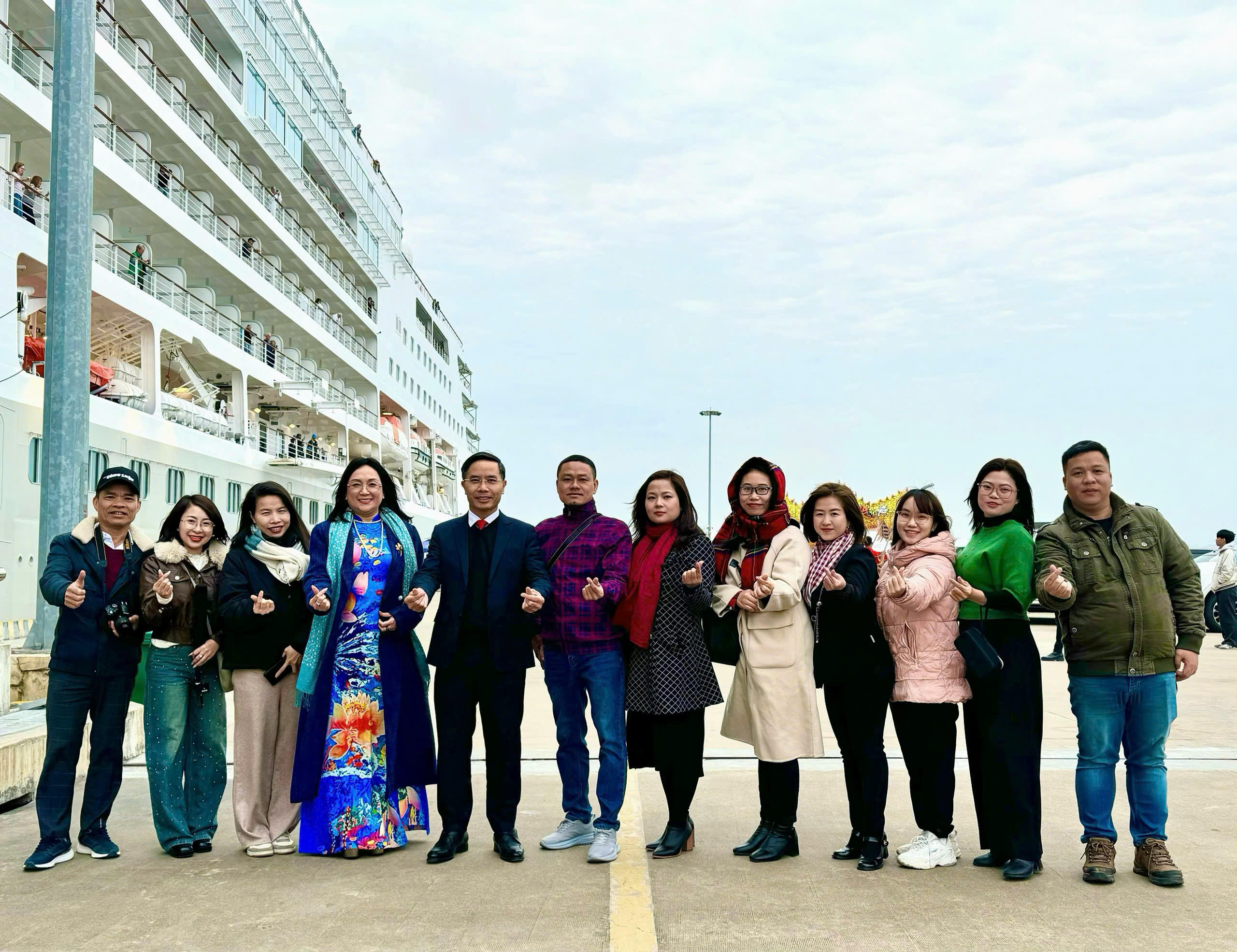 Ngay từ sáng sớm, ông Phạm Đức Ấn - Chủ tịch UBND tỉnh Quảng Ninh (người thứ 5 từ trái sang) đã có mặt tại Cảng tàu khách quốc tế Hạ Long để chào đón những vị khách "xông đất" |