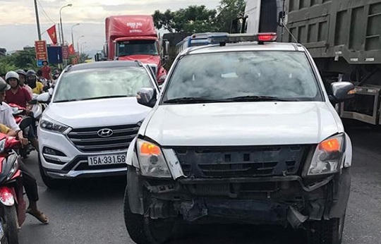 Ngay lập tức, tổ công tác số 1 đã trao đổi với tổ công tác số 4 đang làm nhiệm vụ trên QL 10 cùng phối hợp kiểm tra, xử lý xe vi phạm. Đến 7 giờ 50, Tổ công tác số 4 đã phát hiện xe ô tô vi phạm tại ngã ba QL 10 và QL 18. Tuy nhiên, lái xe tiếp tục chống đối hiệu lệnh dừng xe để kiểm tra và tăng ga đâm thẳng vào xe của lực lượng cảnh sát giao thông khiến đầu xe bị biến dạng rồi bỏ chạy về hướng Hải Phòng.