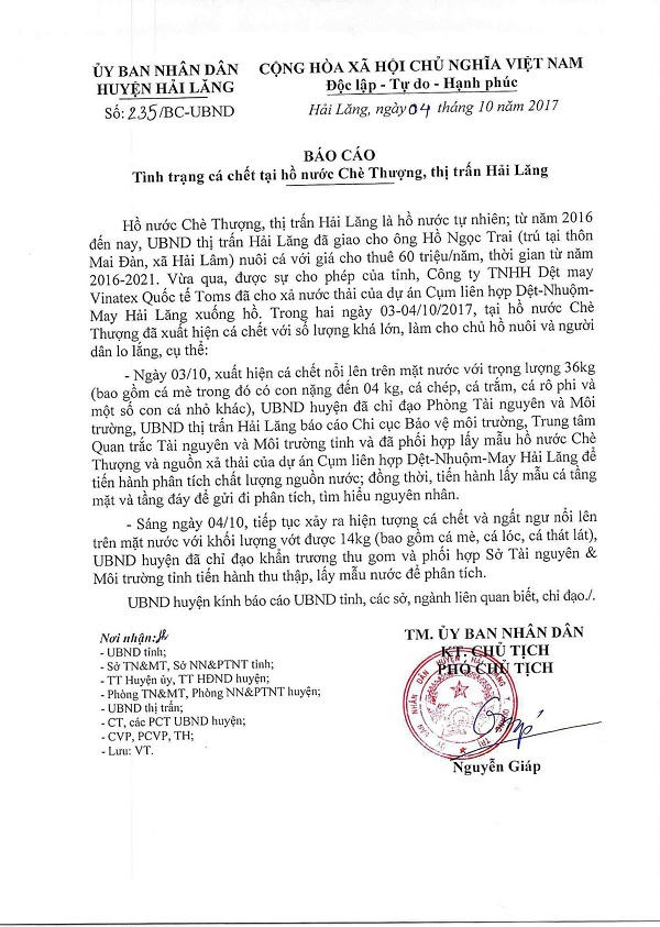 “Vừa qua, được sự cho phép của tỉnh, Cty TNHH Dệt may Vinatex Quốc tế Toms đã cho xả nước thải của Dự án Cụm liên hợp dệt – nhuộm – may Hải Lăng xuống hồ. Trong hai ngày 3 - 4/10, tại hồ nước Chè Thượng đã xuất hiện cá chết số lượng khá lớn, làm cho chủ hồ nuôi và người dân lo lắng” – báo cáo tình trạng cá chết tại hồ nước Chè Thượng nêu rõ.