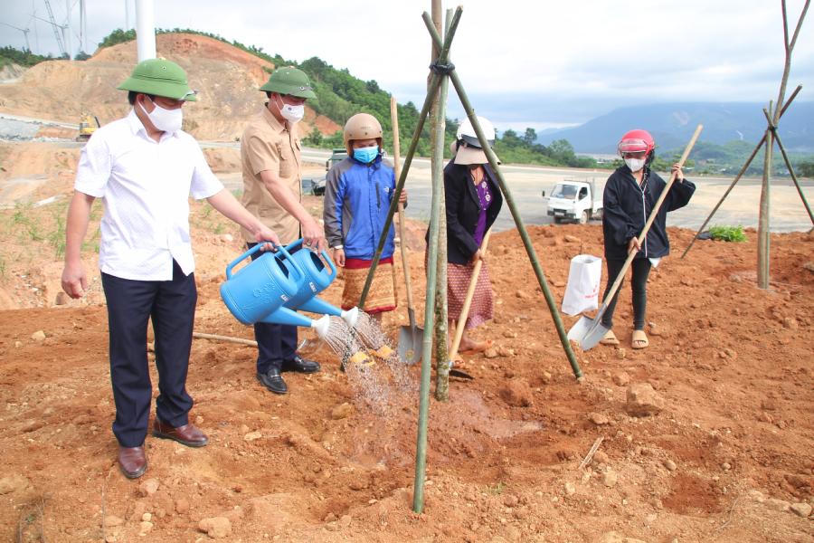 Chủ tịch UBND tỉnh Quảng Trị và huyện Hướng Hóa tham gia trồng cây ngay dưới chân cột điện gió. (Hình chụp ngày 23/8) |