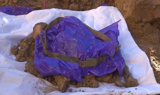 Tại hố chôn này, đội cất bốc tìm thấy nhiều mẫu xương, răng lẫn lộn vào nhau, kèm theo các di vật như thắt lưng nữ, cúc áo, tăng bạt…