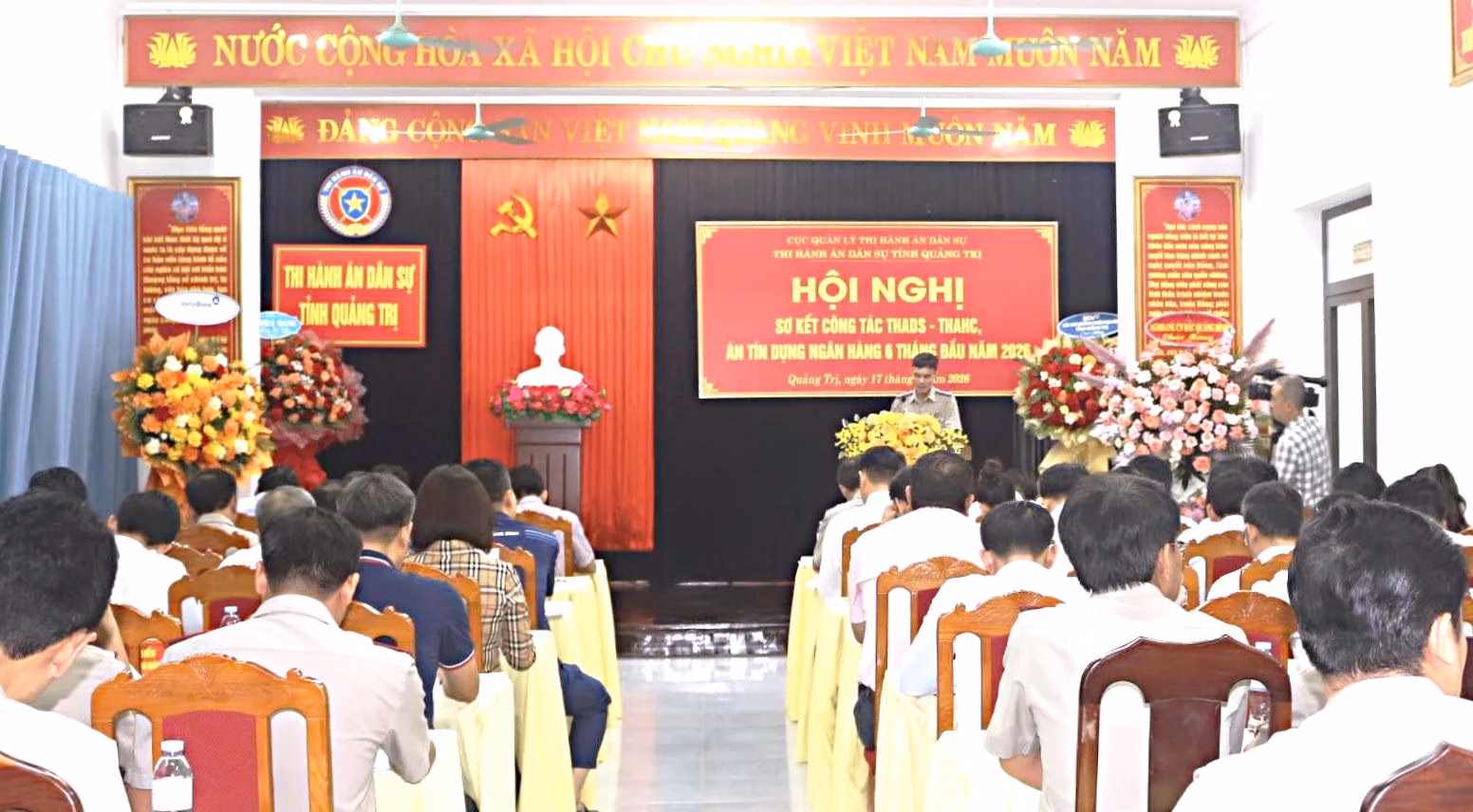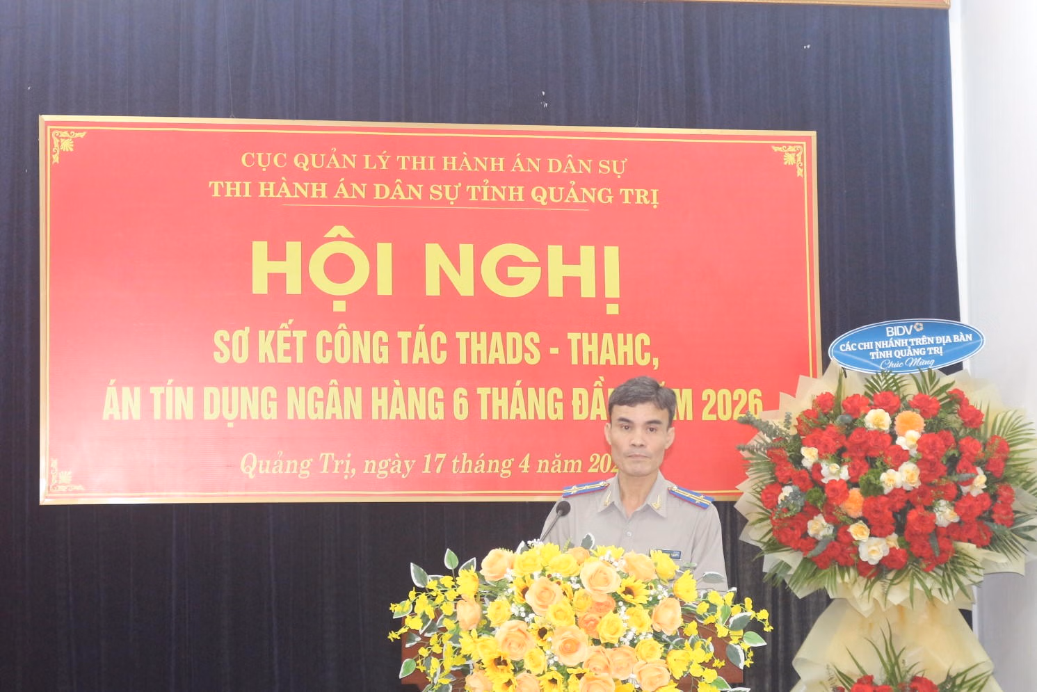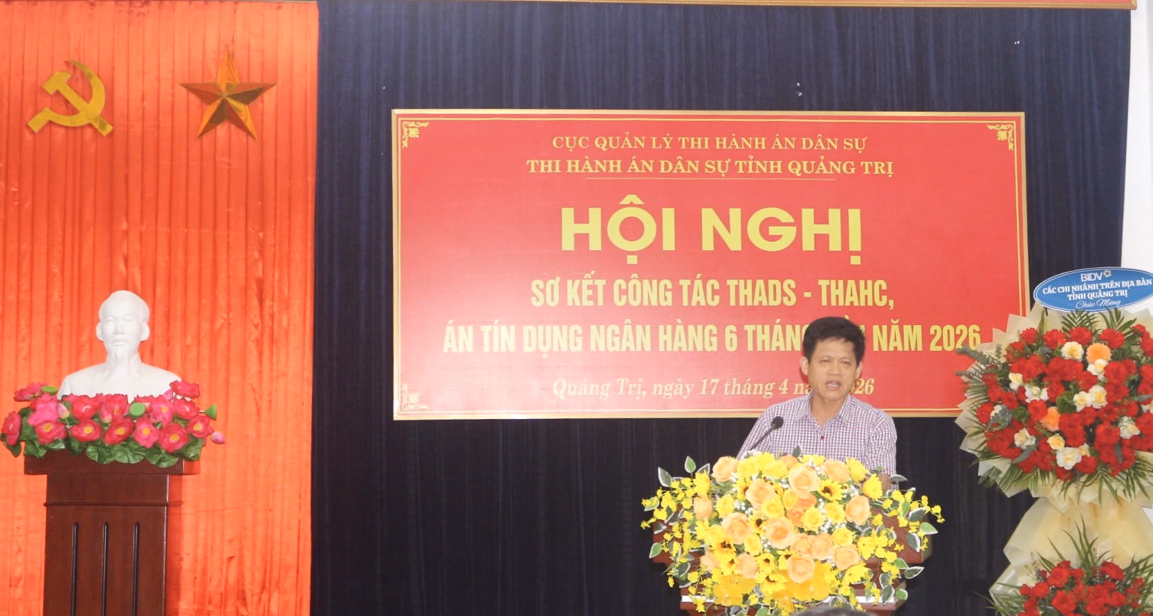 Chiều 17/4, THADS tỉnh Quảng Trị tổ chức Hội nghị sơ kết công tác thi hành án dân sự, thi hành án hành chính 6 tháng đầu năm 2026; đánh giá kết quả thi hành án liên quan đến tín dụng, ngân hàng và đề ra nhiệm vụ, giải pháp chủ yếu 6 tháng cuối năm 2026. Dự và chỉ đạo hội nghị có ông Lê Văn Bảo, Phó Chủ tịch UBND tỉnh, Trưởng Ban Chỉ đạo THADS tỉnh; đại diện lãnh đạo các sở, ngành, cơ quan tư pháp và các tổ chức tín dụng, ngân hàng trên địa bàn.