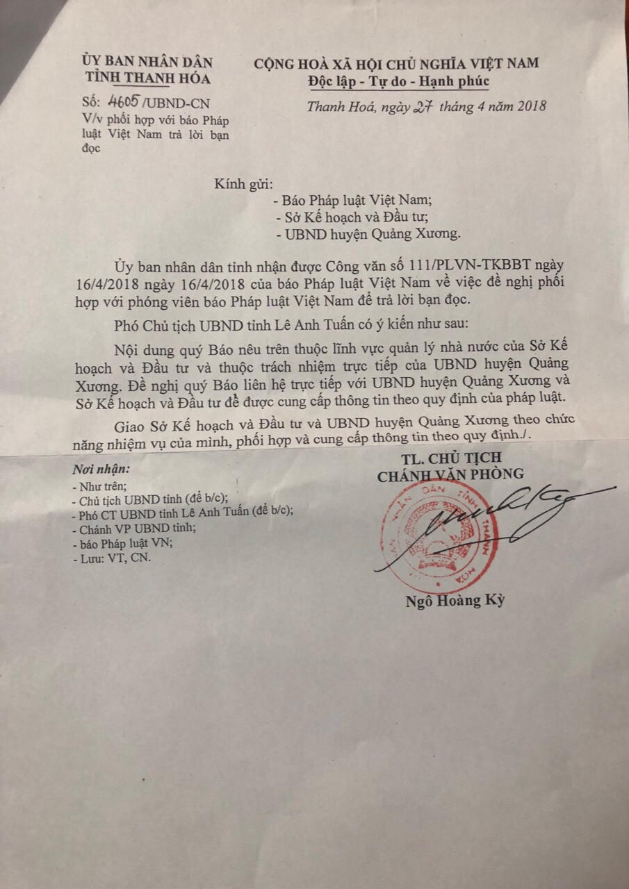 Ngày 27/4/2018, UBND tỉnh Thanh Hoá cũng đã có văn bản số 4605/UBND-CN chỉ đạo UBND huyện Quảng Xương phối hợp cung cấp thông tin làm rõ phản ánh của bạn đọc về lợi ích nhóm trong dự án đường giao thông Quảng Bình đi Quảng Thái. Tuy nhiên, UBND Quảng Xương vẫn “mũ ni che tai” phớt lờ chỉ đạo của UBND tỉnh Thanh Hoá.