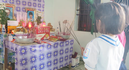 Ba đứa nhỏ là ba đứa cháu ruột của bà Đường. Ngồi trước ban thờ Trung và Hương, cụ bà đầu bạc không còn sức để khóc thành tiếng.