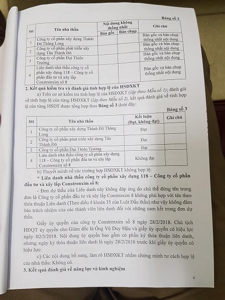 Tại báo cáo mà Ban QLDA huyện Quế Võ cung cấp, 1 trong 4 nhà thầu nộp hồ sơ dự thầu bị Ban QLDA huyện Quế Võ đánh giá không hợp lệ là liên danh nhà thầu Công ty cổ phần xây dựng 118 – Công ty cổ phần đầu tư và xây lắp Contrenxim số 8 nên chỉ còn lại 3 nhà thầu tham dự “đấu thầu” vì lý do: