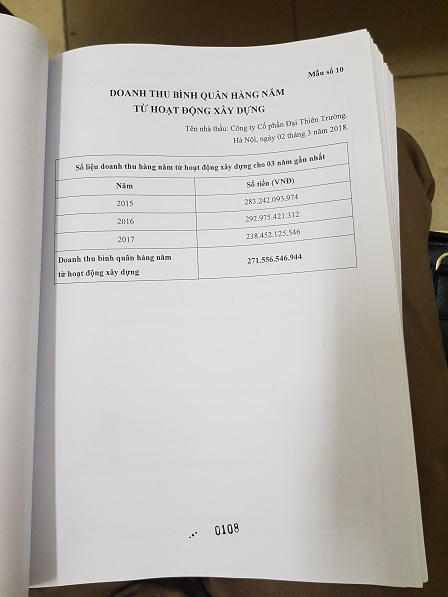 Tại báo cáo tài chính của doanh nghiệp này kê khai tại hồ sơ dự thầu về doanh thu bình quân từ hoạt động xây dựng trong 3 năm (2015, 2016, 2017) lần lượt là: năm 2015 đạt 99,975 tỷ đồng, năm 2016 đạt 128,873 tỷ đồng, năm 2017 đạt 87,547 tỷ đồng.
