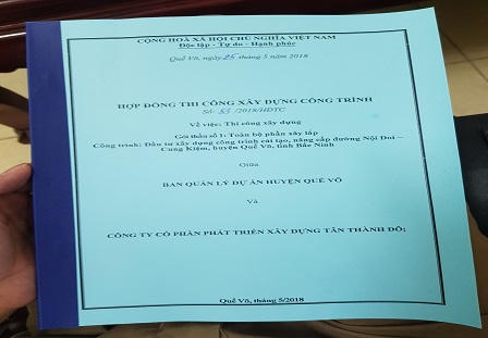 Tại hợp đồng thi công xây dựng số 53/2018/HĐTC ngày 25/5/2018 của Ban QLDA huyện Quế Võ và Công ty cổ phần phát triển xây dựng Tân Thành Đô có tổng giá trị là 33,256 tỷ đồng mặc dù đã ký kết nhưng không có thời gian khởi công, thi công dự án cụ thể. Phóng viên thắc mắc về việc này, thì ông Trần Thái Sơn – Phó giám đốc Ban QLDA vẫn “ậm ừ”: “Cũng chưa biết ngày nào thi công vì còn vướng mặt bằng”.