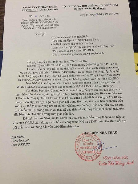 Bên cạnh đó, nhà thầu trúng thầu là Công ty Cổ phần phát triển xây dựng Tân Thành Đô (địa chỉ: P602 – Tháp A – Tòa nhà Hà Thành Plaza, 102 Thái Thịnh, phường Trung Liệt, quận Đống Đa, TP. Hà Nội) mặc dù kê khai không rõ ràng trong hồ sơ dự thầu, nghi vấn kê khống hồ sơ dự thầu nhưng vẫn trúng thầu. Cùng với đó, nhà thầu này cũng “vướng” phải nhiều chuyện “lùm xùm”, bị dư luận, doanh nghiệp khác “đồn đoán” là nhà thầu chuyên “đi chợ” thầu, kiện tụng, gây kinh hãi cho nhiều nhà thầu khác tại nhiều gói thầu của nhiều tỉnh trên cả nước…