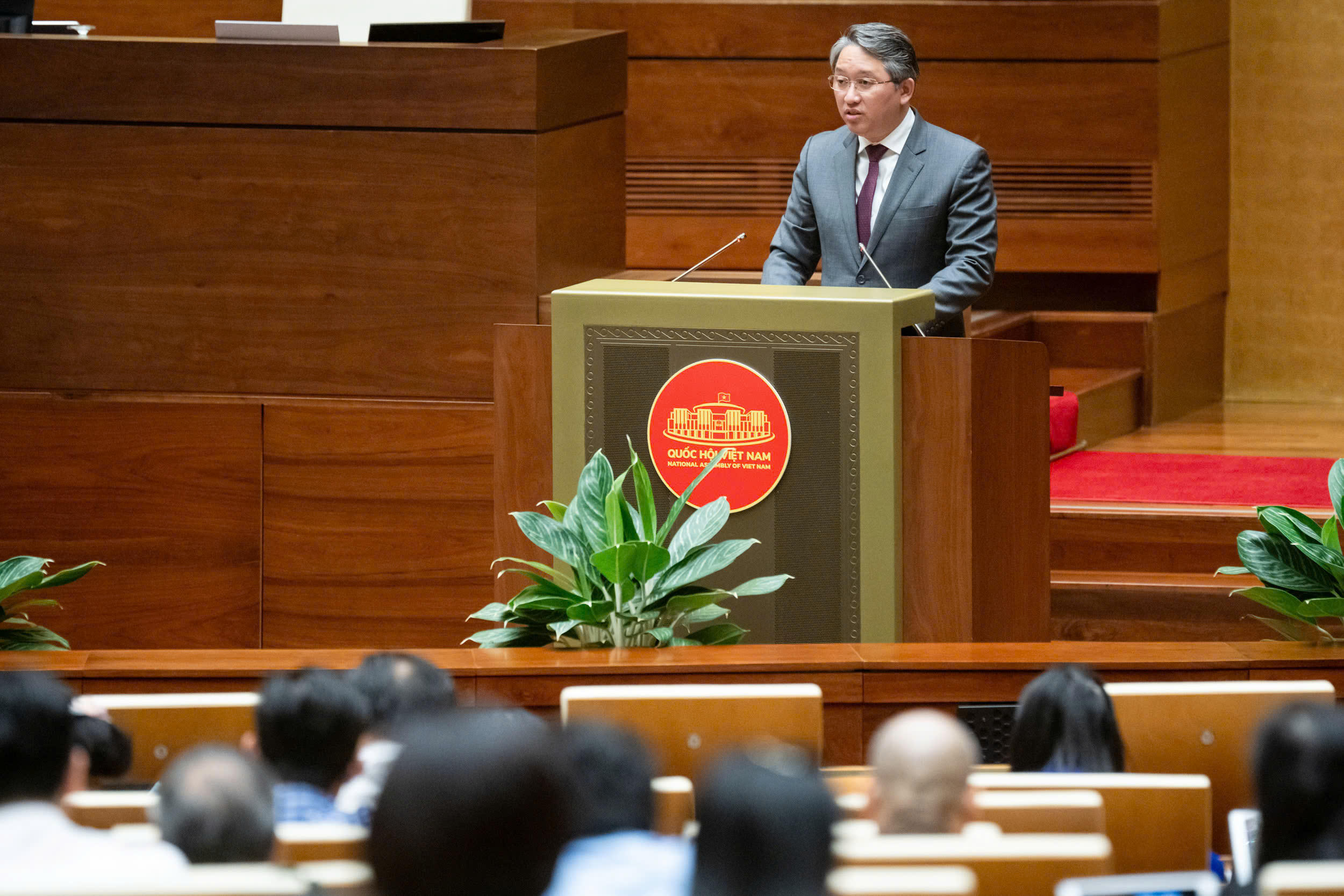 Bộ trưởng Bộ Tư pháp Nguyễn Hải Ninh báo cáo tiếp thu, giải trình, chỉnh lý dự thảo Nghị quyết của Quốc hội. (Ảnh: Cổng TTĐTQH) |