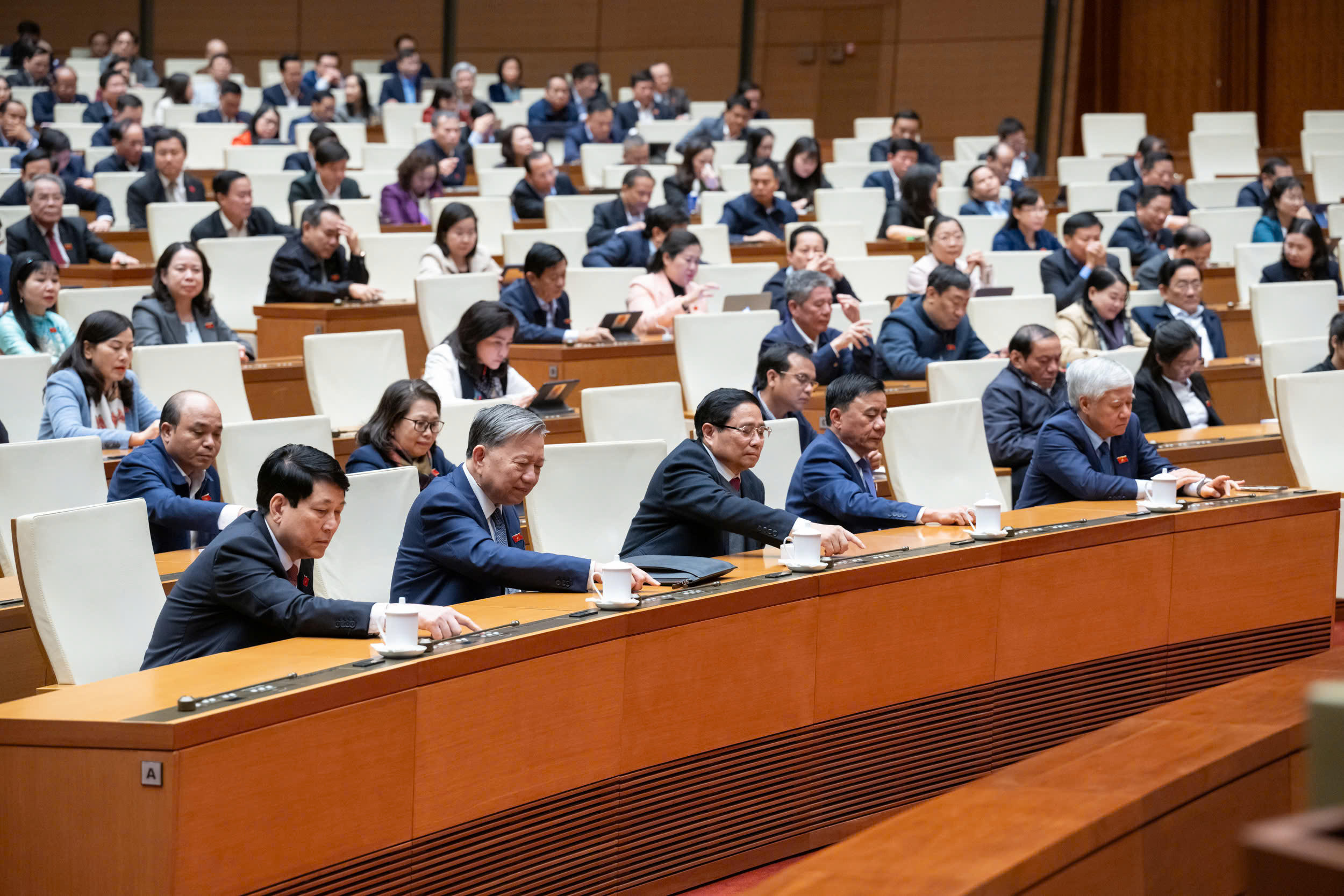 Các đại biểu là lãnh đạo Đảng, Nhà nước bấm nút biểu quyết thông qua các Nghị quyết. (Ảnh: Cổng TTĐTQH) |