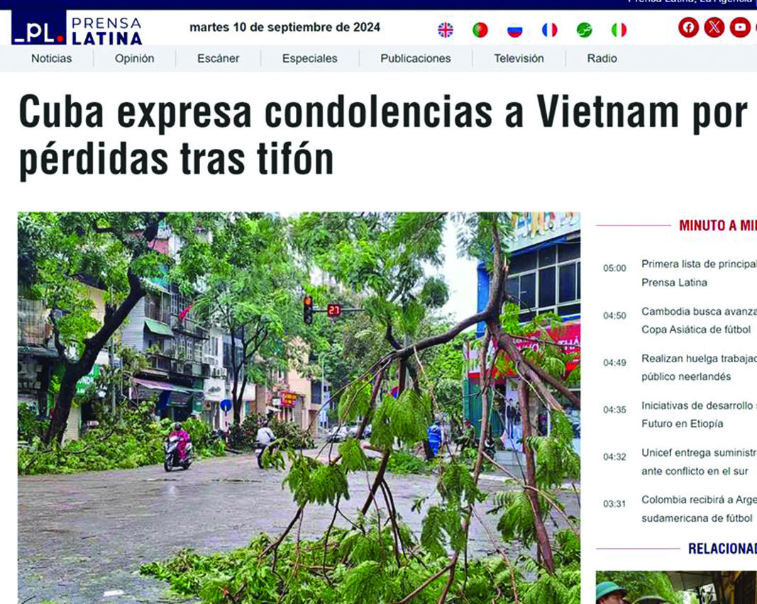 Báo điện tử Prensa Latina mới đây đã đăng tải lời chia buồn của Chủ tịch Cuba Miguel Díaz-Canel tới Đảng Cộng sản Việt Nam, Chính phủ và người dân trước những thiệt hại do bão số 3 gây ra. Thông qua tài khoản của mình trên mạng xã hội X, nhà lãnh đạo Cuba đã truyền tải tất cả tình đoàn kết của đảo quốc Caribe tới người dân Việt Nam trong thời điểm khó khăn này.