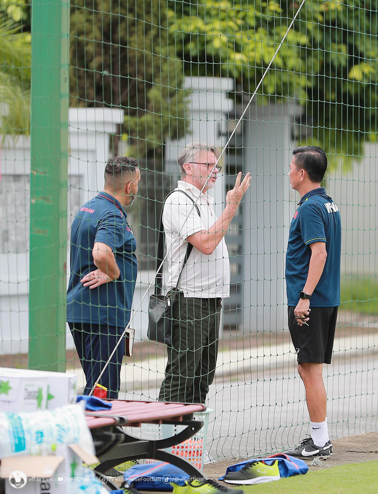 HLV Philippe Troussier cùng Trợ lý Moulay Azzeggouarh trao đổi thông tin với HLV Hoàng Anh Tuấn trên sân tập. Ảnh VFF |