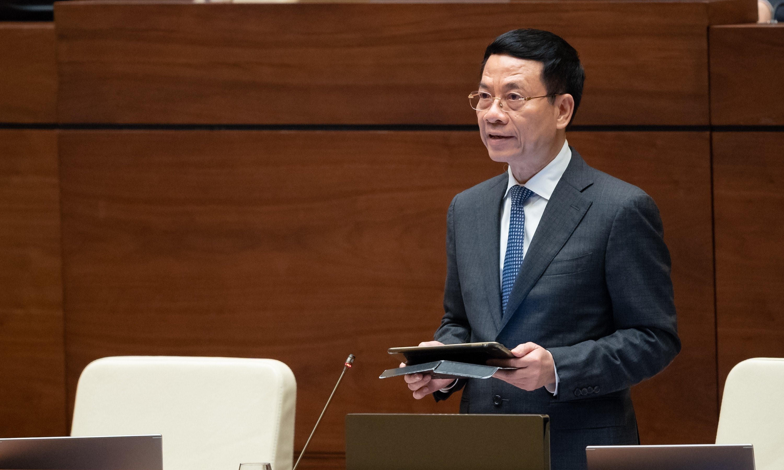 Bộ trưởng Nguyễn Mạnh Hùng phát biểu giải trình về dự án Luật Viễn thông (sửa đổi). |