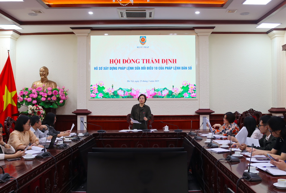 (PLVN) - Chiều 25/3, tại trụ sở Bộ Tư pháp, chủ trì hội đồng thẩm định Hồ sơ xây dựng Pháp lệnh sửa đổi điều 10 của pháp lệnh dân số , Phó chủ tịch Hội đồng thẩm định Nguyễn Thị Hạnh , Vụ trưởng Vụ Pháp luật hình sự - hành chính y êu cầu cơ quan soạn thảo cần tính đến các cơ chế dài hạn, có tầm nhìn xa, dự báo xu hướng sinh sản, đồng thời xây dựng chính sách gắn kết mức sinh với chất lượng dân số .