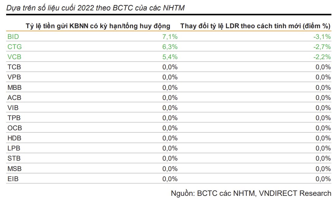 Nhóm phân tích cho rằng Thông tư 26 sẽ mang lại lợi thế cho các ngân hàng có nguồn tiền gửi dồi dào từ KBNN. Vietcombank, BIDV, VietinBank sẽ được hưởng lợi khi tỷ lệ LDR mới giảm đáng kể.