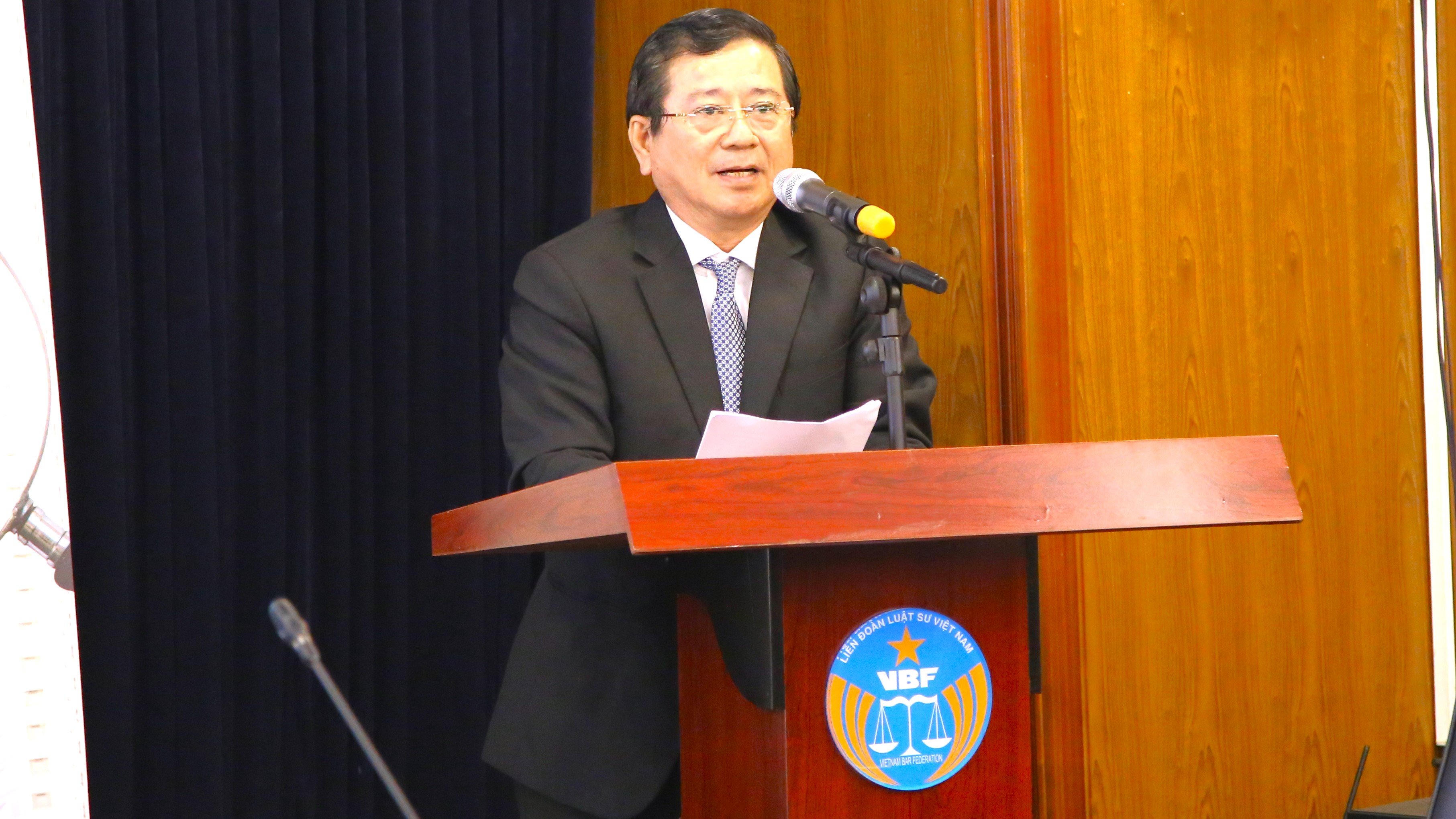 Luật sư Nguyễn Văn Hậu - Ủy viên Thường vụ, Chủ nhiệm Cơ quan truyền thông Liên đoàn Luật sư Việt Nam trình bày tham luận. |