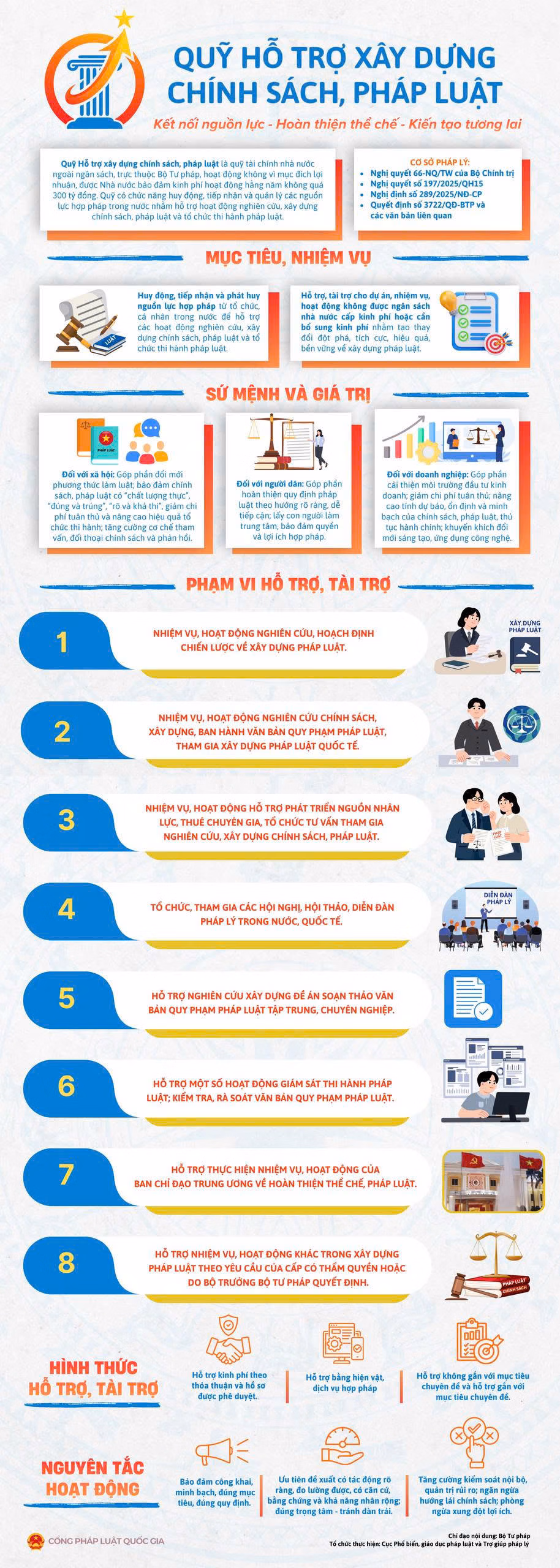 Bộ Tư pháp giới thiệu infographic Quỹ hỗ trợ xây dựng chính sách, pháp luật: Kết nối nguồn lực - Hoàn thiện thể chế - Kiến tạo tương lai