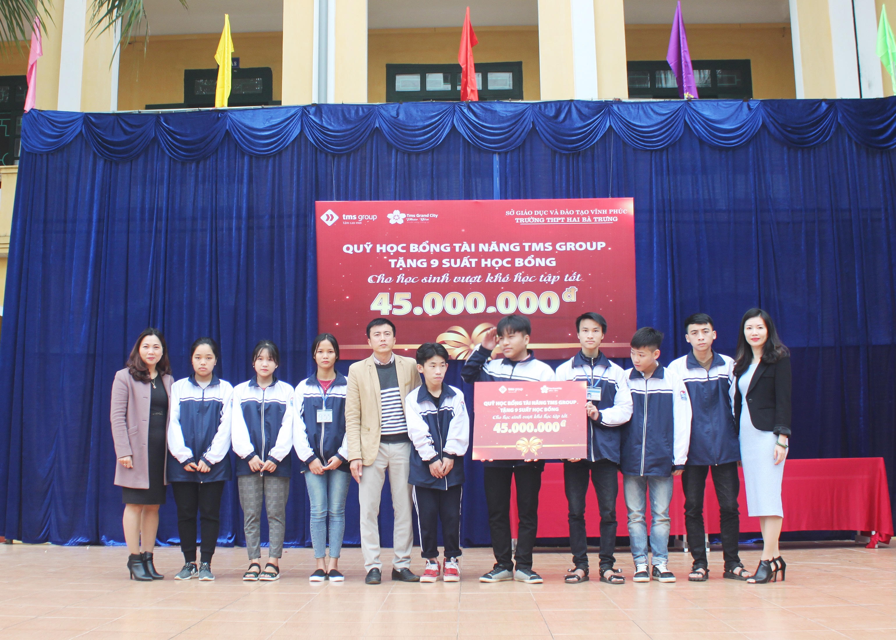 Quỹ học bổng tài năng TMS Group đã trao tặng 9 suất học bổng cho 9 em học sinh vượt khó học tập tốt tại trường THPT Hai Bà Trưng. 9 suất học bổng này của các em học sinh được Tập đoàn TMS chuyển thành 9 sổ tiết kiệm, trị giá 5 triệu đồng/sổ trao tận tay cho các em và gia đình.