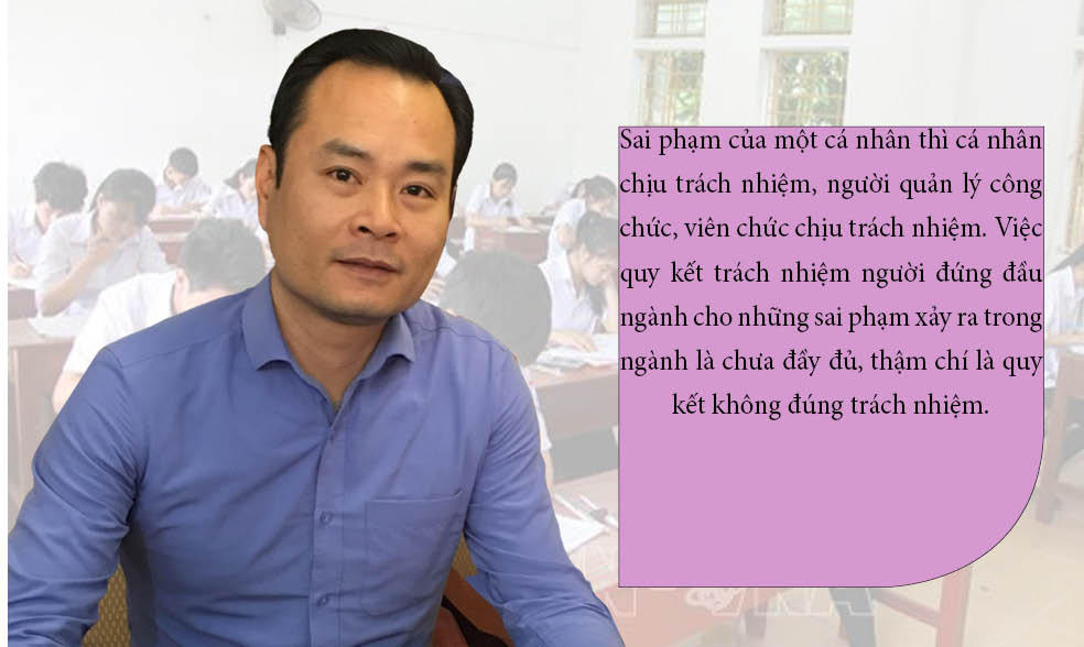 Tôi lấy ví dụ, gian lận điểm thi có lỗi của cán bộ làm công tác khảo thí của các địa phương xảy ra sai phạm; của các phụ huynh liên quan (không có nhờ vả thì không có sửa điểm, nâng điểm), lỗi này thuộc về cá nhân người vi phạm, không thể quy kết cho ngành được.