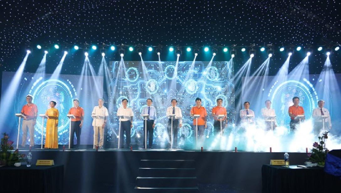 Lãnh đạo tỉnh Bình Định, lãnh đạo tập đoàn FPT và quan khách nhấn nút khởi công dự án Trung tâm trí tuệ nhân tạo. |