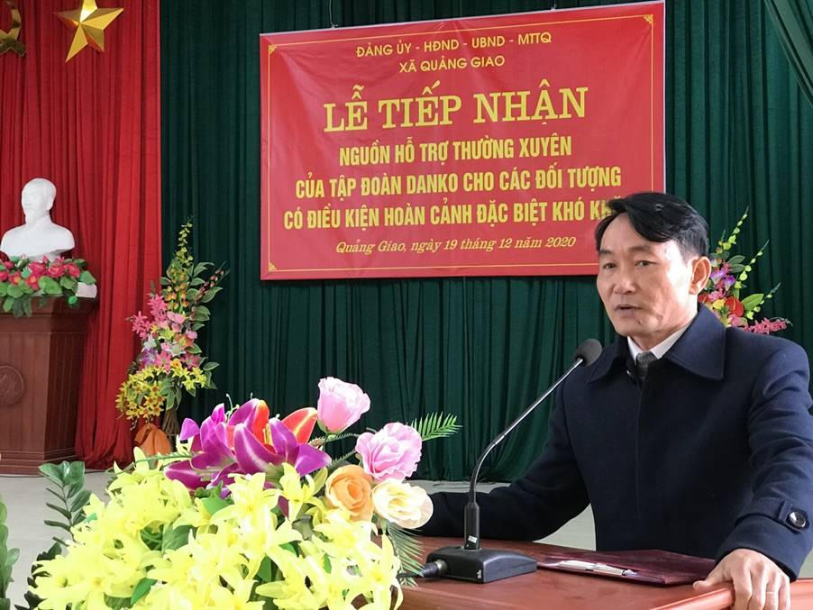 Phát biểu tại lễ tiếp nhận nguồn hỗ trợ thường xuyên, Danko Group cho biết: Kể từ khi thành lập đến nay, song song với các hoạt động kinh doanh, Tập đoàn Danko xác định trách nhiệm cộng đồng là hoạt động không thể thiếu trên con đường phát triển của Tập đoàn. Với việc hỗ trợ thường xuyên cho 20 người có hoàn cảnh đặc biệt khó khăn xã Quảng Giao, chúng tôi mong muốn góp thêm một phần sức lực để chung tay cùng những hoàn cảnh khó khăn vươn lên trong cuộc sống.