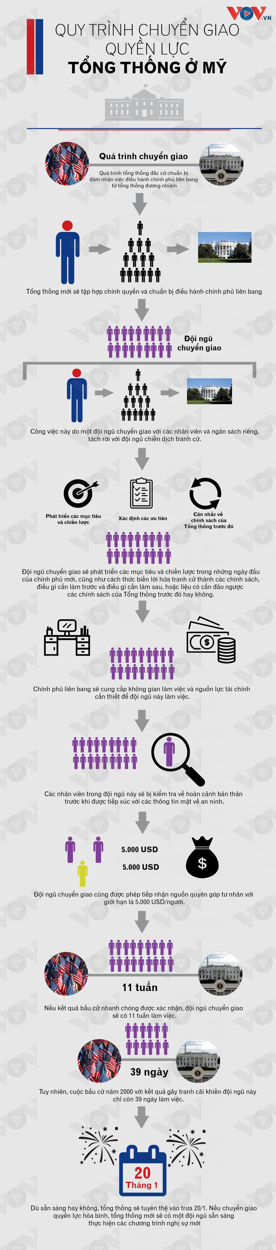 Dưới đây là quy trình chuyển giao quyền lực tổng thống của Mỹ, khi mà tổng thống đắc cử chuẩn bị đảm nhận việc điều hành chính phủ liên bang từ tổng thống đương nhiệm.