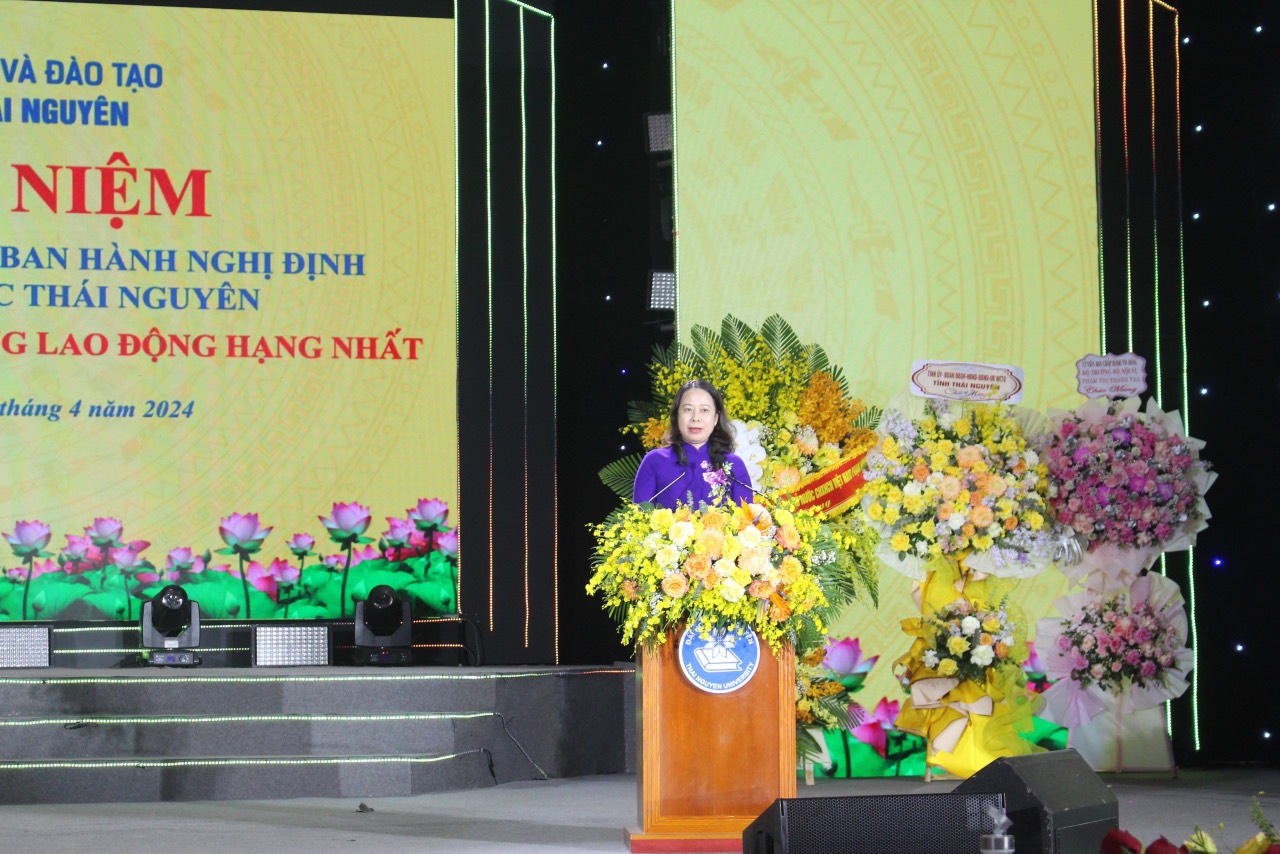 Phát biểu tại buổi lễ, Quyền Chủ tịch nước Võ Thị Ánh Xuân ghi nhận và biểu dương những kết quả, thành tựu sau 30 năm xây dựng và trưởng thành của Đại học Thái Nguyên, một trong những trường đại học trọng điểm Quốc gia.