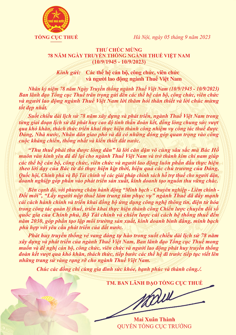 Trong thư Quyền Tổng cục trưởng Tổng cục Thuế Mai Xuân Thành đã lời thăm hỏi thân thiết và lời chúc mừng tốt đẹp nhất đến các thế hệ CB, CC, VC & NLĐ ngành Thuế Việt Nam.