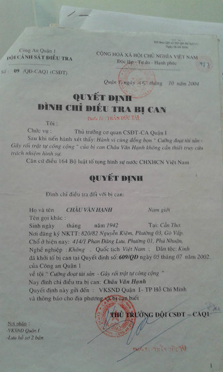 Cơ quan tố tụng quận 1 buộc phải trả tự do cho ông Hạnh, không tuyên bố ông vô tội mà ra quyết định: