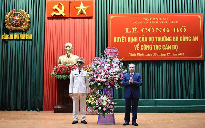 | Đại tá Phạm Văn Sơn, Giám đốc Công an tỉnh Ninh Bình trao quyết định và chúc mừng đồng chí Trần Xuân Phú. |