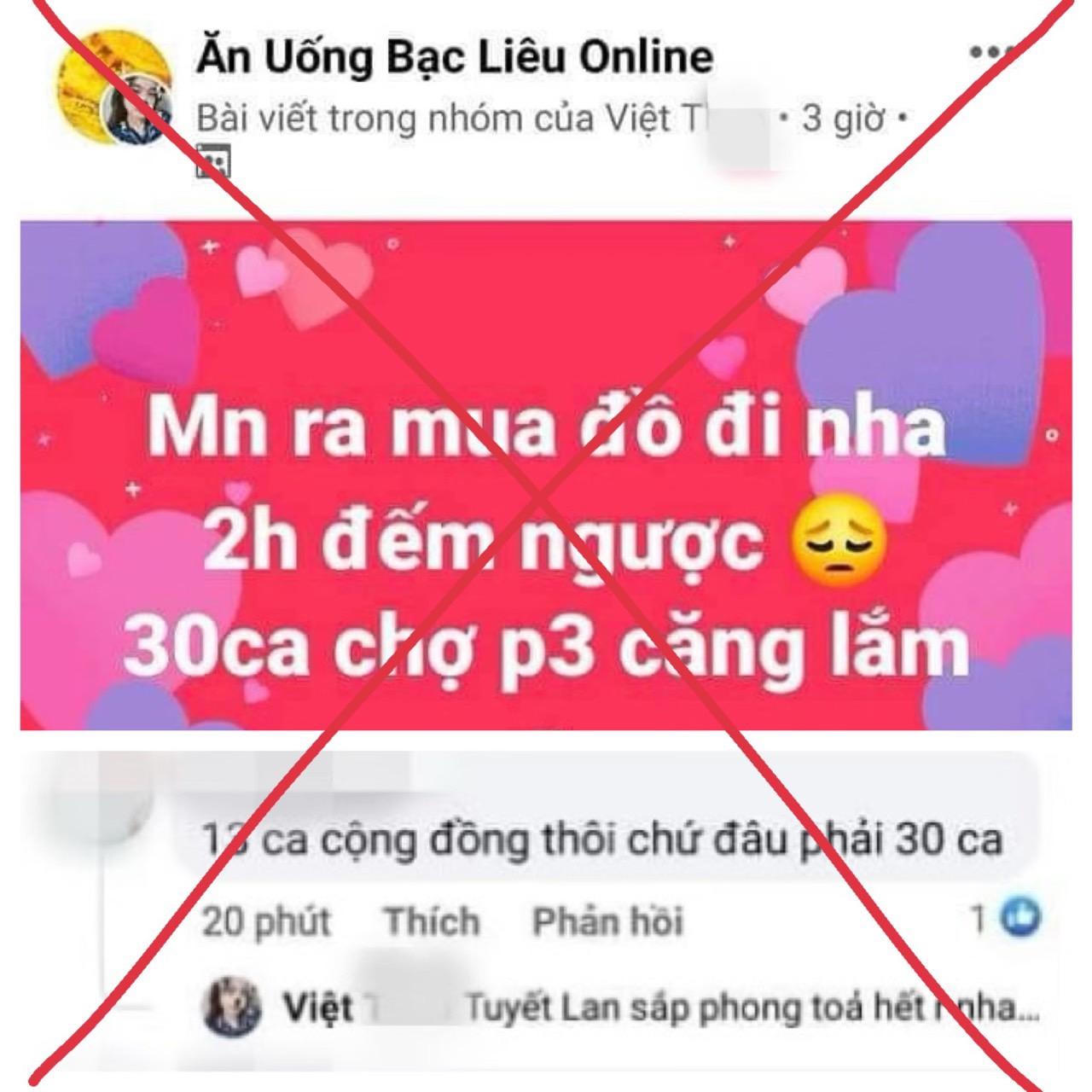 Trước đó, vào khoảng 12 giờ ngày 14/9, D.V.T sử dụng tài khoản Facebook cá nhân đăng tải thông tin “Mn ra mua đồ đi nha 2h đếm ngược 30ca chợ p3 căng lắm r” trên nhóm “Ăn Uống Bạc Liêu online”. Đồng thời, khi có người vào bình luận trên bài đăng, D.V.T còn trả lời bình luận với nội dung “Sắp phong tỏa hết r nha”.