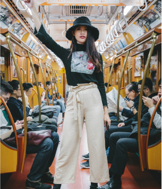 Quỳnh Châu “chất lừ” trên tàu điện với trang phục đơn giản. Không thể phủ nhận làn da sáng hồng chính là một trợ thủ đắc lực giúp cô tỏa sáng.