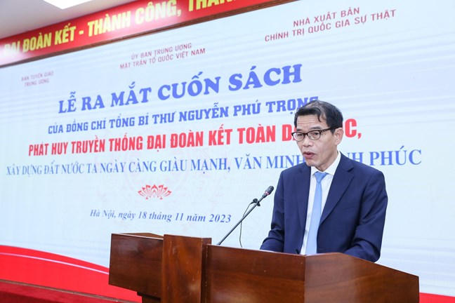 Chiều 18/11, tại Hà Nội, nhân dịp kỷ niệm 93 năm Ngày thành lập Mặt trận Dân tộc thống nhất Việt Nam - Ngày truyền thống Mặt trận Tổ quốc Việt Nam (18/11/1930 - 18/11/2023), đồng thời góp phần quán triệt, triển khai thực hiện Nghị quyết Hội nghị Trung ương 8 khóa XIII, Ủy ban Trung ương Mặt trận Tổ quốc (UBTƯ MTTQ) Việt Nam chủ trì, phối hợp với Ban Tuyên giáo Trung ương và Nhà xuất bản Chính trị quốc gia Sự thật tổ chức Lễ ra mắt cuốn sách “Phát huy truyền thống đại đoàn kết toàn dân tộc, xây dựng đất nước ta ngày càng giàu mạnh, văn minh, hạnh phúc” (cuốn sách) của Tổng Bí thư Nguyễn Phú Trọng.