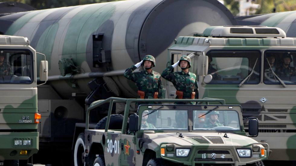 Lực lượng quốc phòng Trung Quốc duyệt binh với tên lửa chứa hạt nhân. Ảnh: Reuters |