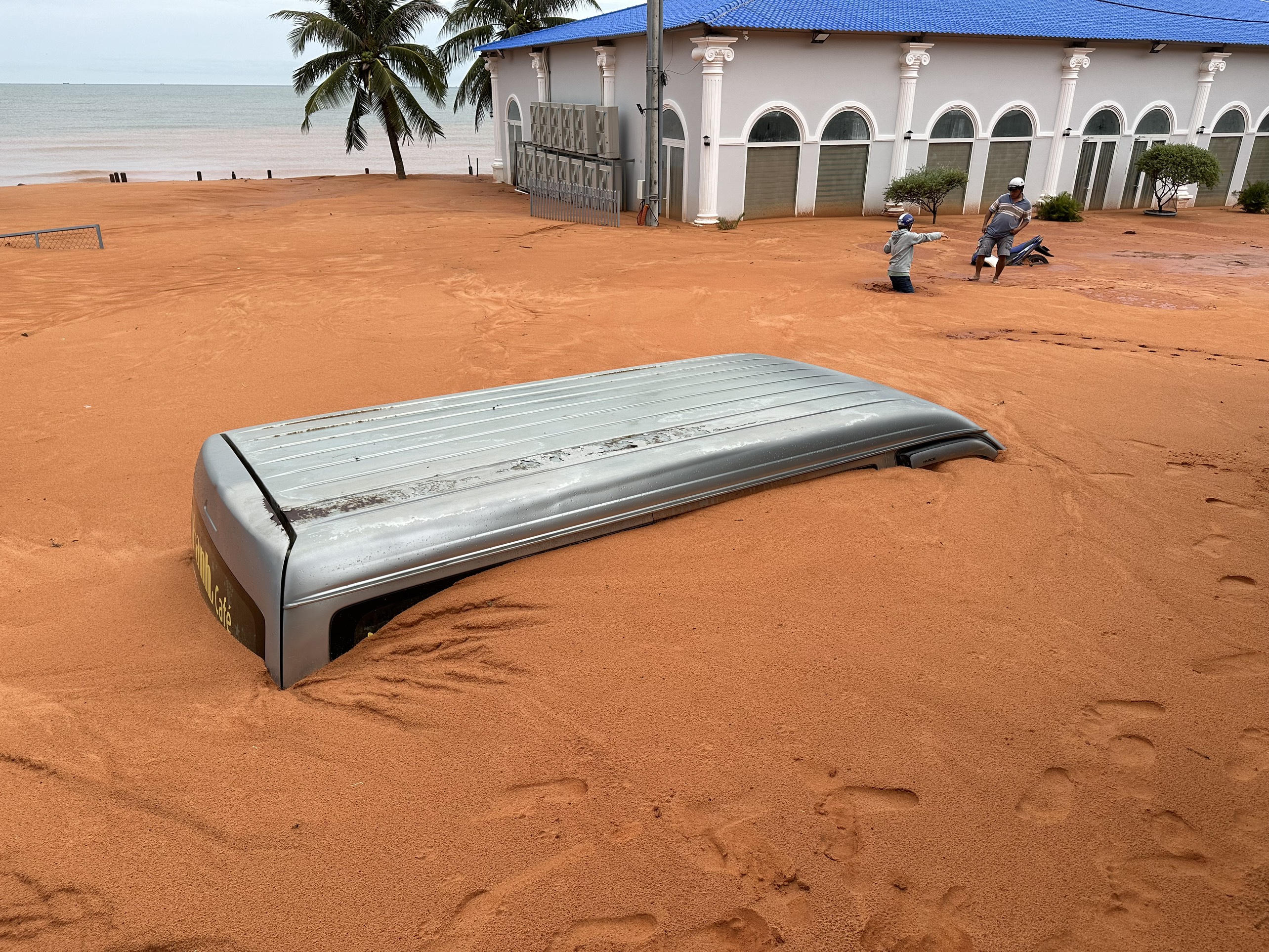 Một chiếc ô tô 16 chỗ gần như bị vùi lấp sạu vụ lũ cát ngày 21/5 ở thành phố Phan Thiết. |