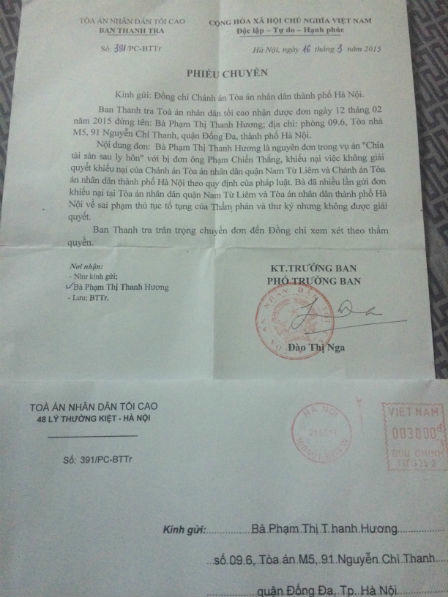 Ngày 12/02/2015 và ngày 16/03/2015, chị Hương đành gửi đơn kêu cứu tới các vị lãnh đạo và các cơ quan có thẩm quyền của TANDTC và VKSNDTC về vụ việc của mình. “Là phụ nữ đang phải thuê nhà để ở và nuôi 2 con nhỏ, tôi vẫn hy vọng các cấp có thẩm quyền sẽ nghe thấu các kêu cứu của mình, sớm giải quyết các khiếu nại và phân chia cho phần tài sản mà tôi có quyền được hưởng, để mẹ con tôi đỡ khổ và vất vả” – chị Hương tủi thân chia sẻ.