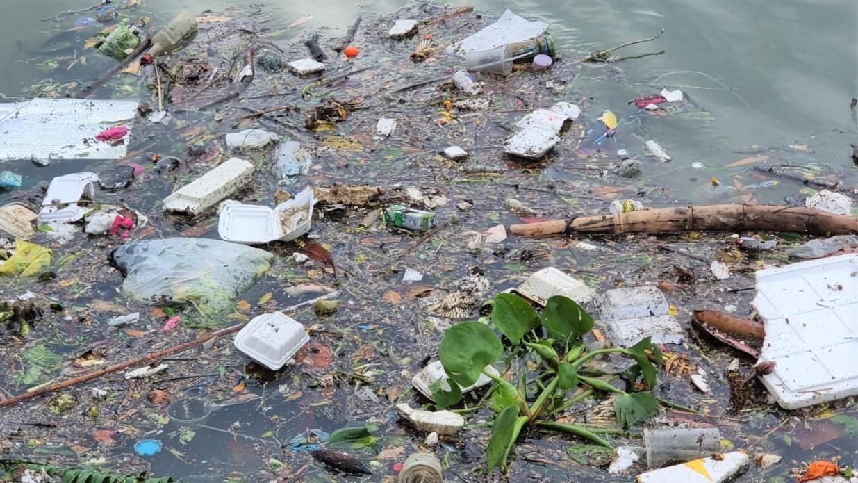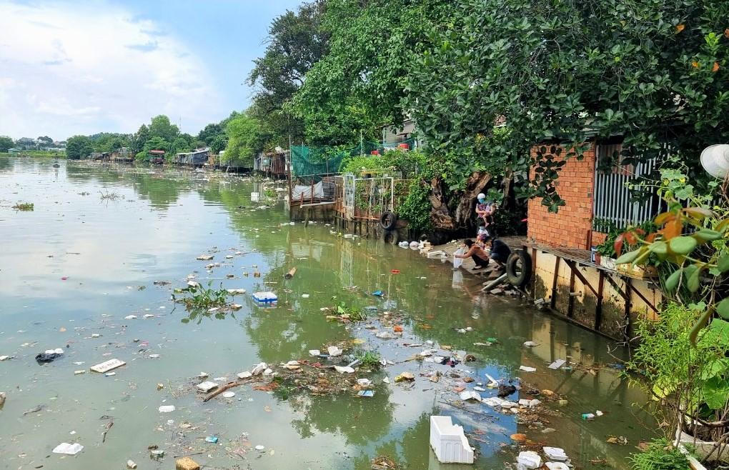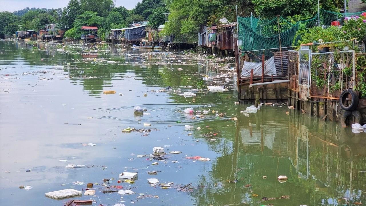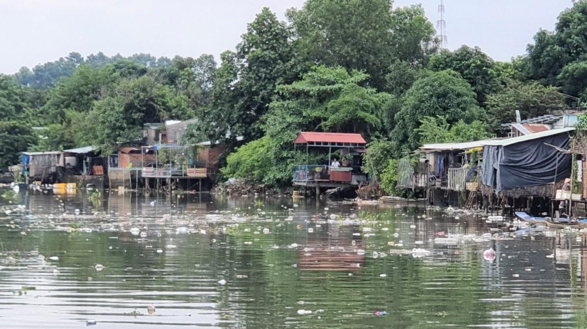 Rác nổi lềnh bềnh phủ kín mặt sông Đồng Nai