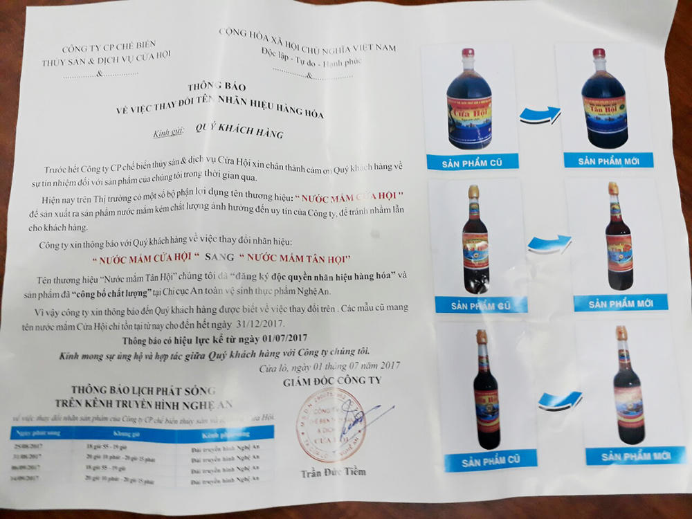 Trong lúc chưa có lời phân giải cuối cùng thì vừa qua Cty CP Chế biến thủy sản và dịch vụ Cửa Hội ra mắt sản phẩm “nước mắm Tân Hội”. Điều này sẽ không có gì nếu như không xuất hiện đoạn video trên trang truyền hình địa phương và tờ Catalo nước mắm Cửa Hội với nội dung: “Hiện nay trên thị trường có một bộ phận lợi dụng thương hiệu “Nước mắm Cửa Hội” để sản xuất nước mắm kém chất lượng, ảnh hưởng đến uy tín của công ty. Để tránh nhầm lẫn cho khách hàng, Cty xin thông báo tới quý khách hàng về việc thay đổi nhãn hiệu từ “Nước mắm Cửa Hội” sang “Nước mắm Tân Hội”.