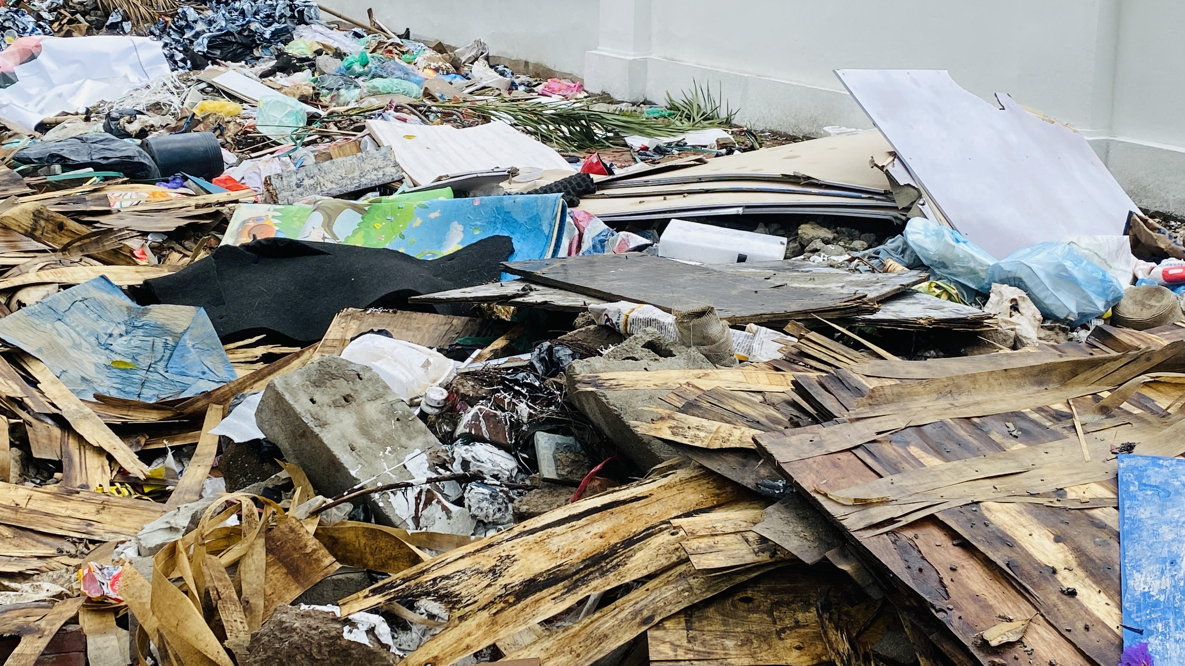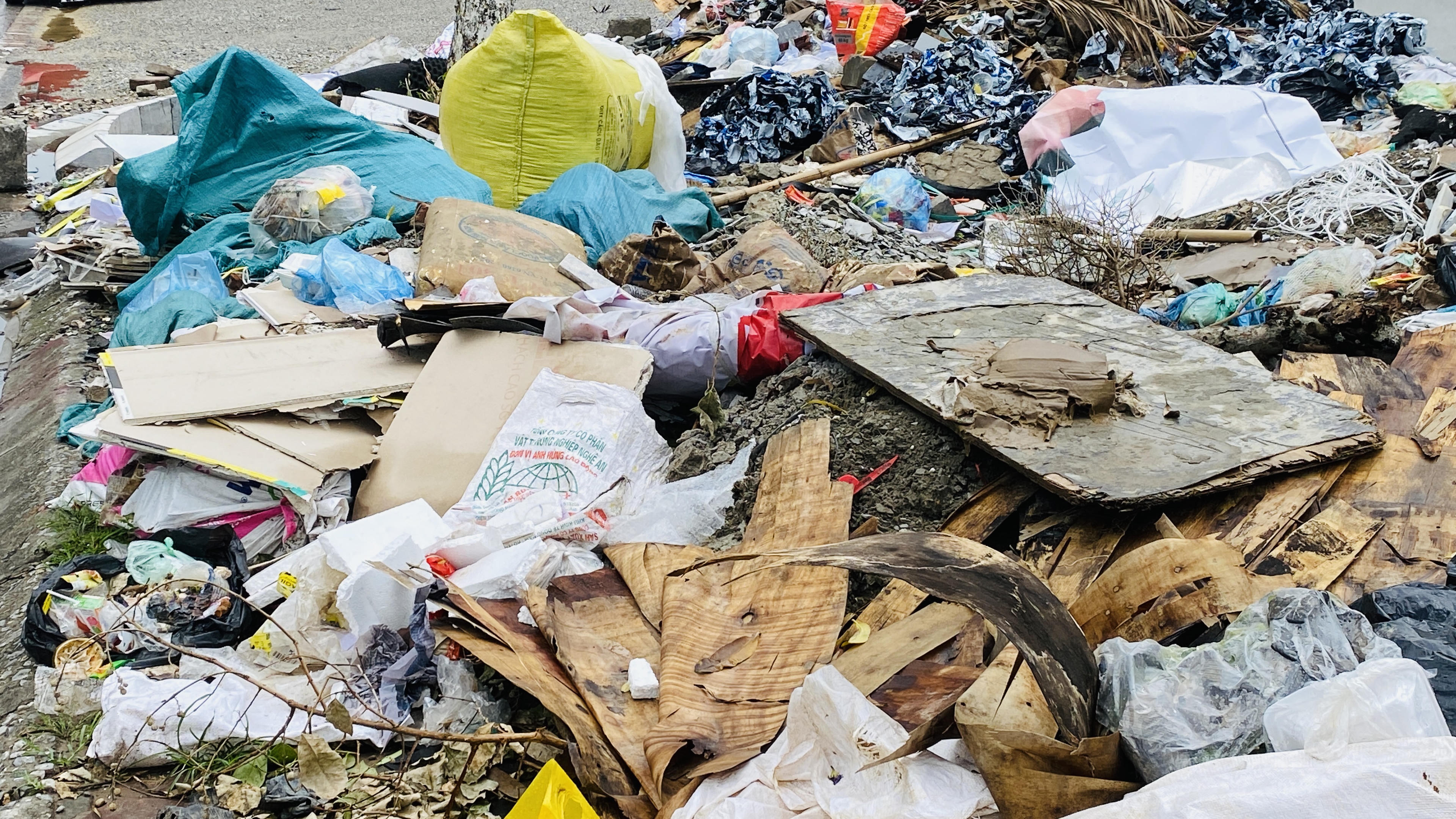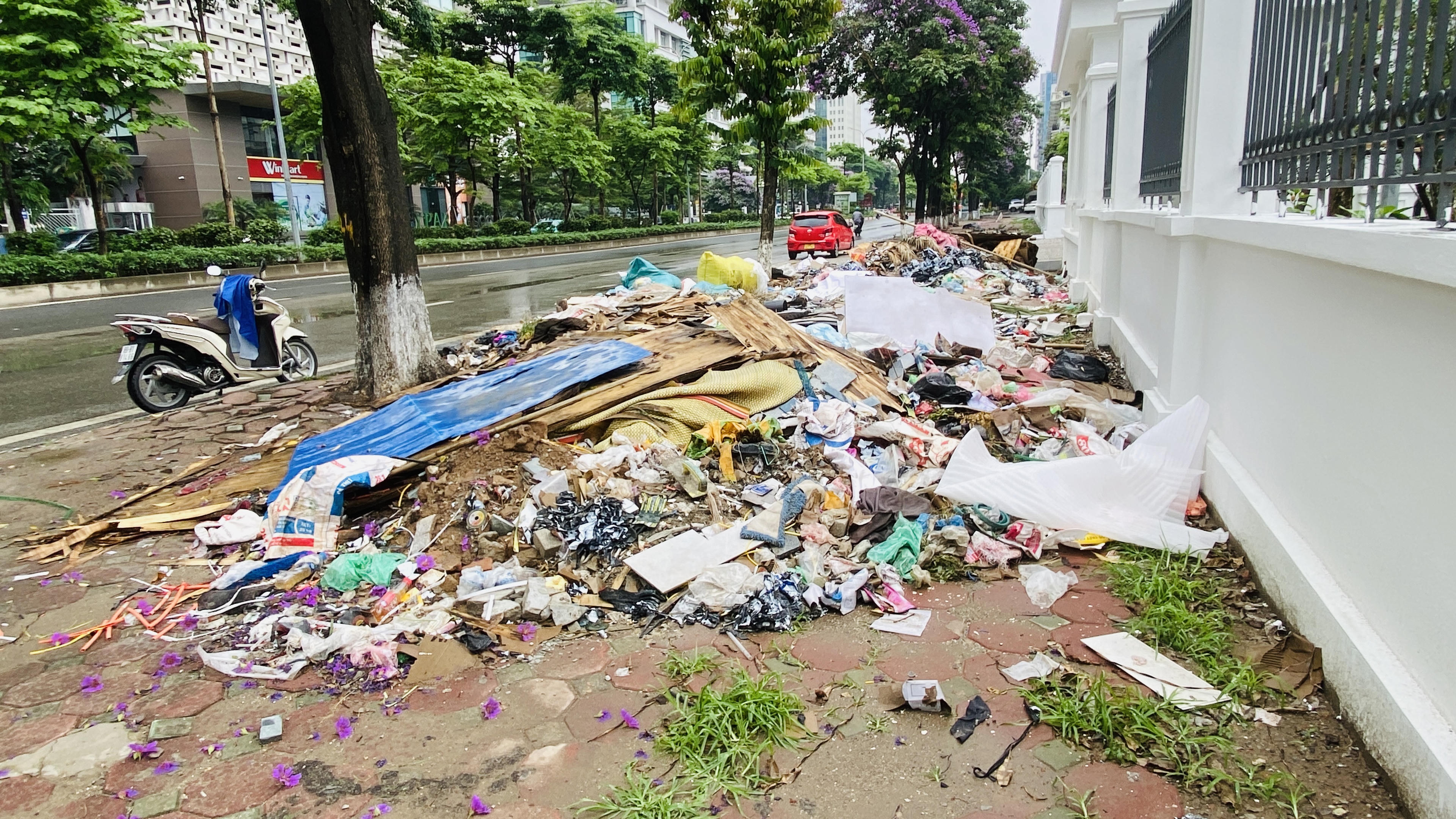 Phóng viên ghi nhận, tại đoạn đường này, rác cồng kềnh từ rác sinh hoạt đến phế thải xây dựng như: đất, đá, gạch vỡ... ngổn ngang trên vỉa hè. Đặc biệt, những loại rác thải nguy hiểm như mảnh kính vỡ, chiếu rách, vụn gỗ cũng được "tập kết" ở đây.