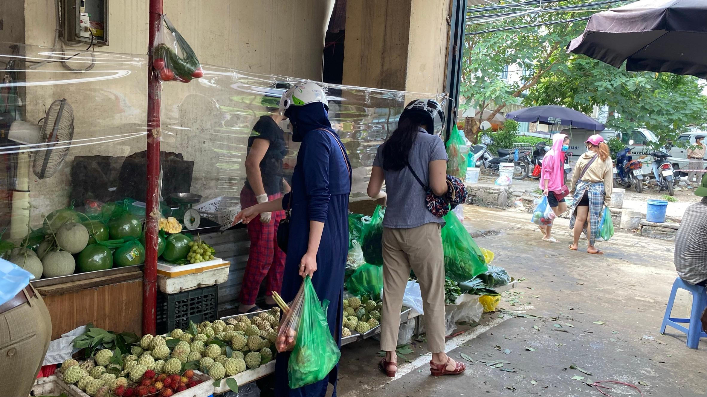 Trước cửa mỗi cửa hàng tại chợ Ngọc Hà đều sử dụng tấm chắn để đảm bảo khoảng cách giữa người mua và người bán. Ảnh: Mỵ Châu |