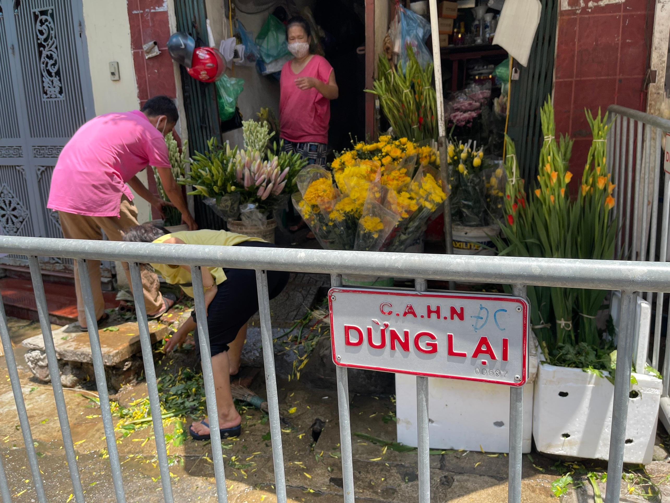 Trước cửa tất cả các hàng, quán đều chăng dây, đảm bảo giữ khoảng cách. Ảnh: Ngọc Nga |