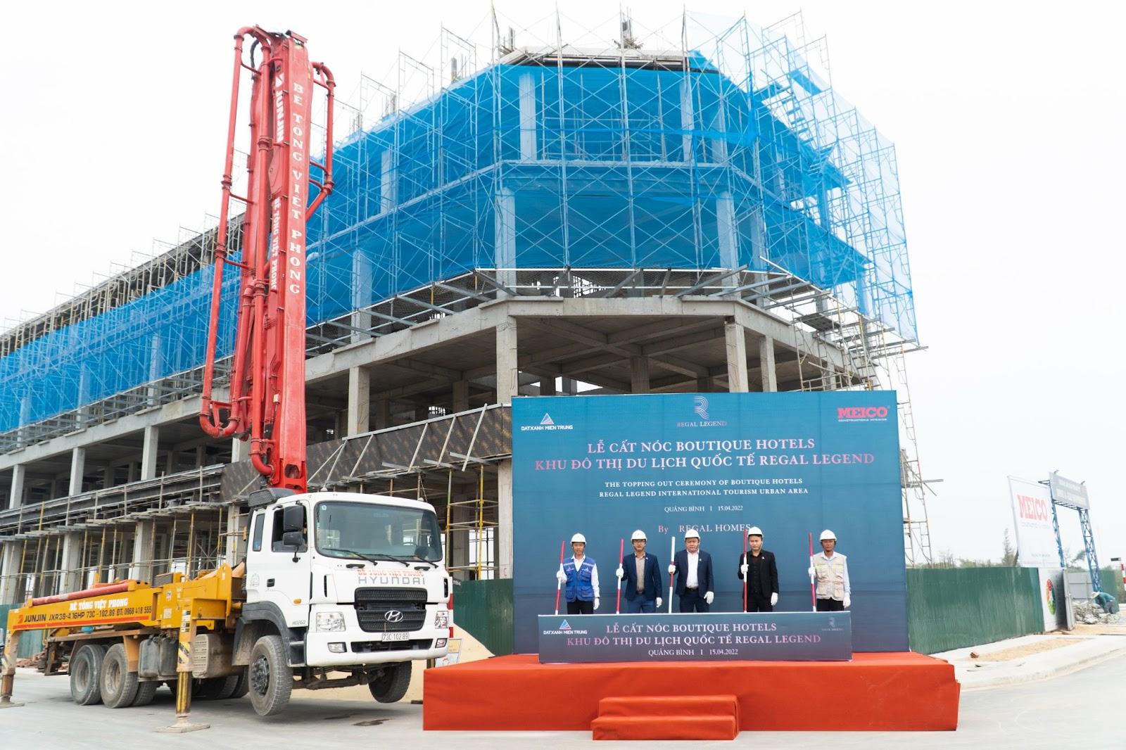 Mới đây ngày 15/4, Đất Xanh Miền Trung vừa tiến hành cất nóc dãy Boutique Hotels thuộc dự án Khu đô thị du lịch quốc tế Regal Legend, tọa lạc vị trí kim cương ngay bán đảo Bảo Ninh, mặt tiền đường Võ Nguyên Giáp nối thẳng ra biển chỉ với 120m, thành phố Đồng Hới, tỉnh Quảng Bình.