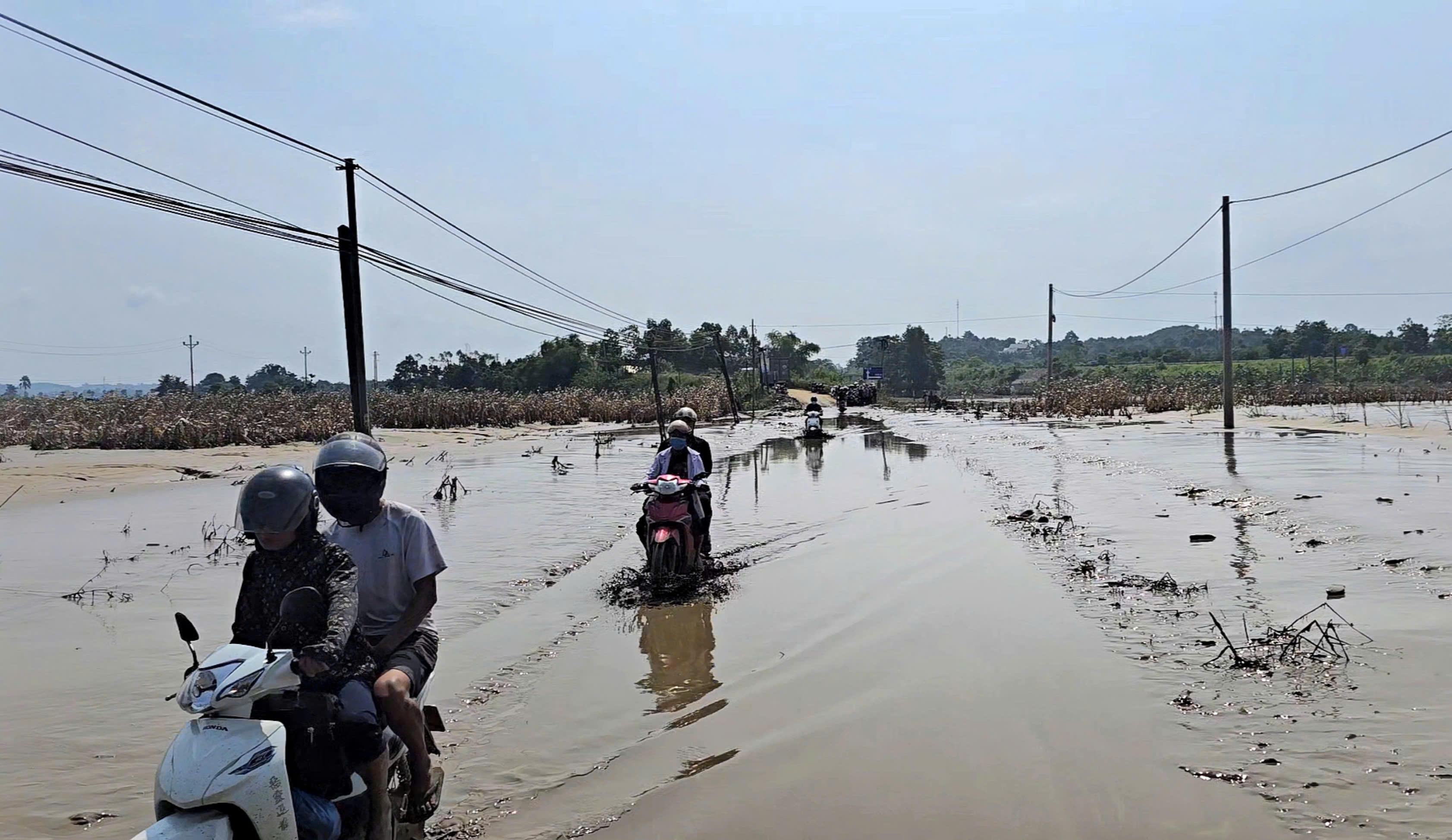 Những con đường trắng băng nước, ngập úng hoa màu. |