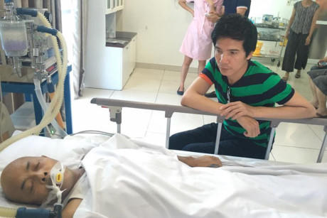 Con trai nghệ sĩ Hán Văn Tình lặng im, nắm tay bố đang rơi vào hôn mê sâu.