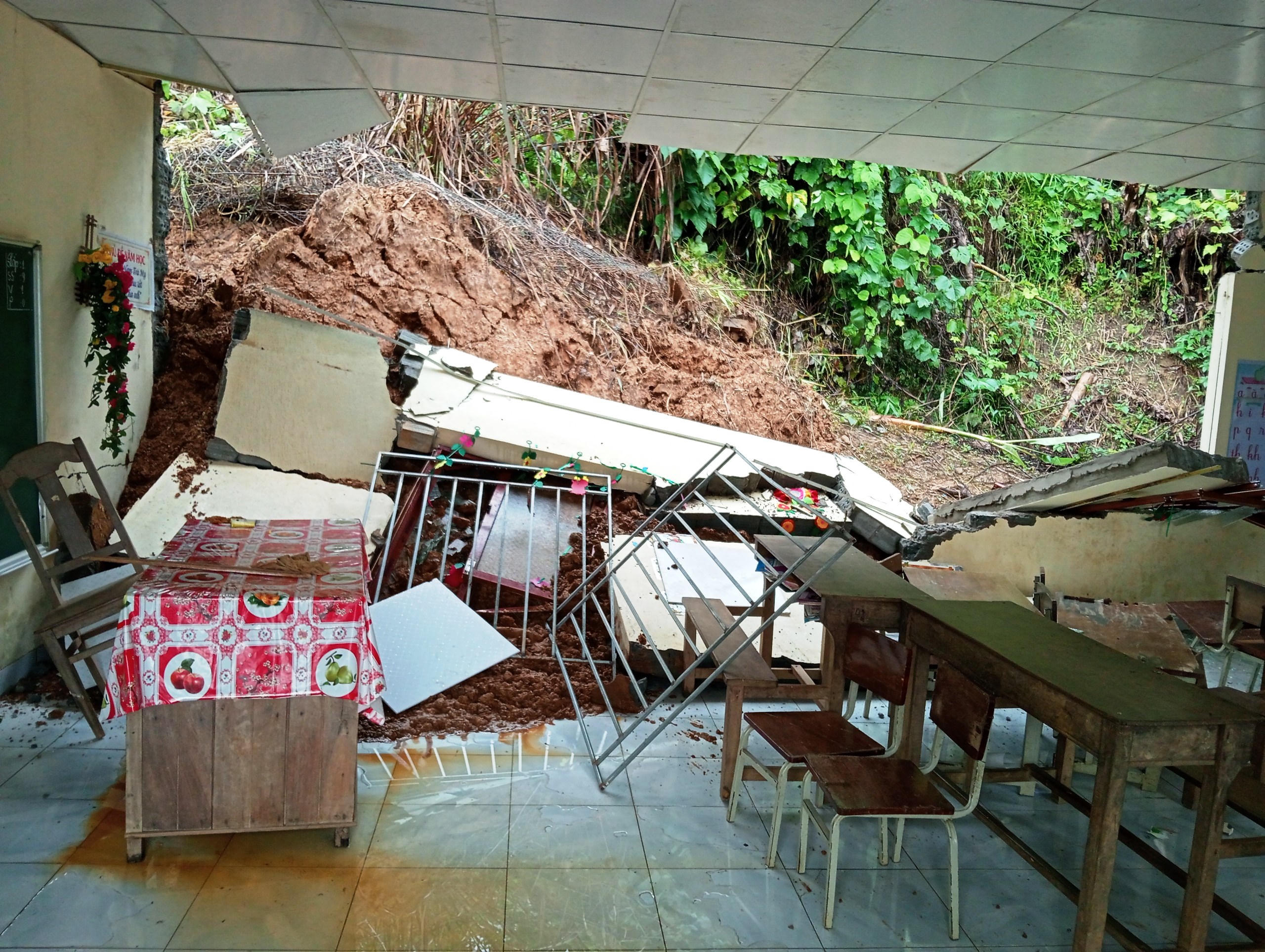 Phòng học đổ sập trong đêm do sạt lở. |