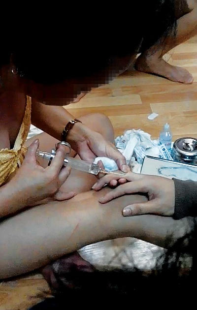 H. mở tủ lấy ra một chai đựng chất lỏng đặc sánh, trong suốt, không nhãn mác đổ chừng 200 ml vào ca inox rồi lấy bông tẩm cồn 90 độ lau sạch bên mông sắp được bơm silicon của Th. Sau khi hút đầy xi lanh chất lỏng từ ca inox, H. gắn kim tiêm vào và bắt đầu nắn, bóp vài vị trí trên mông.